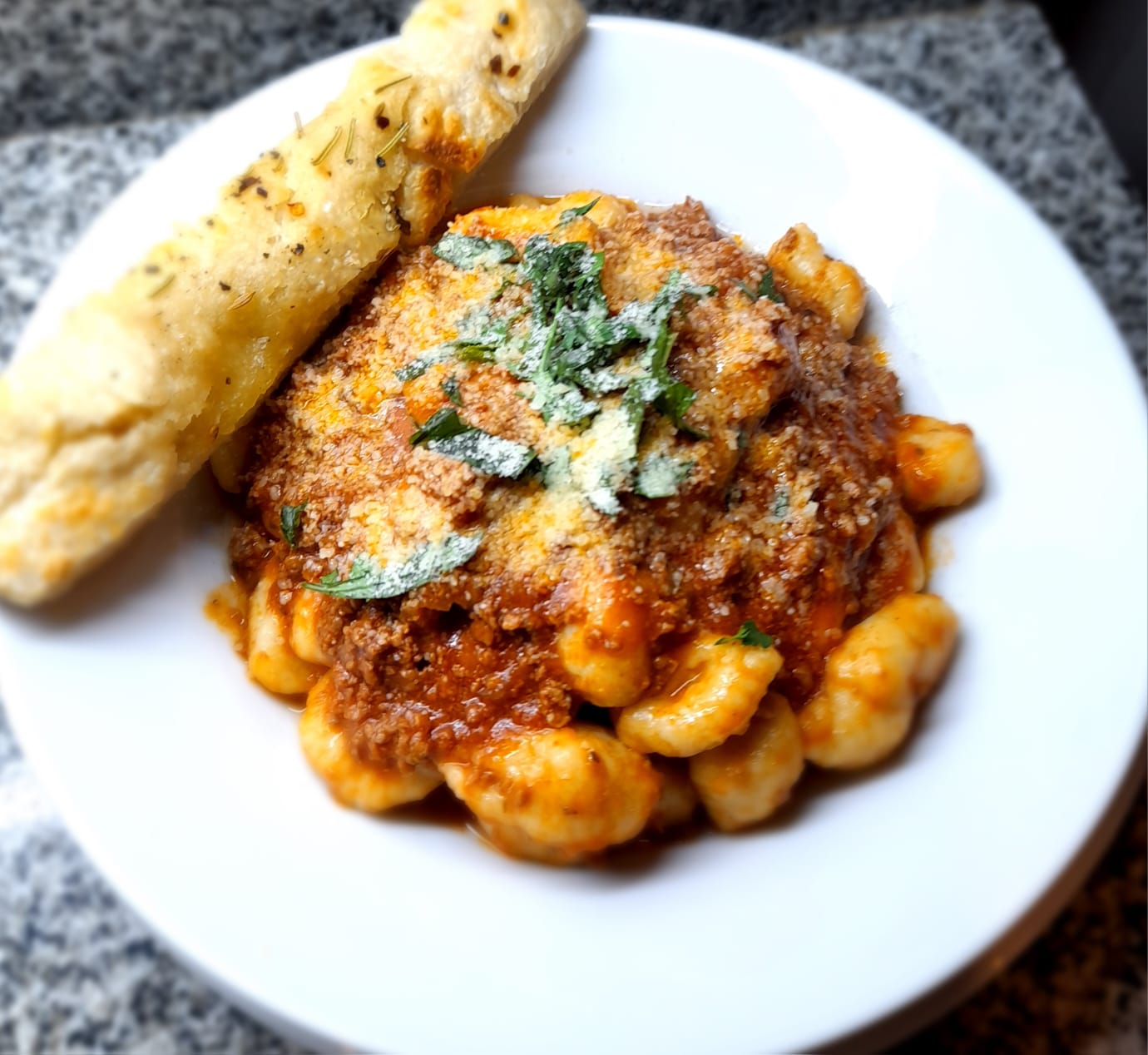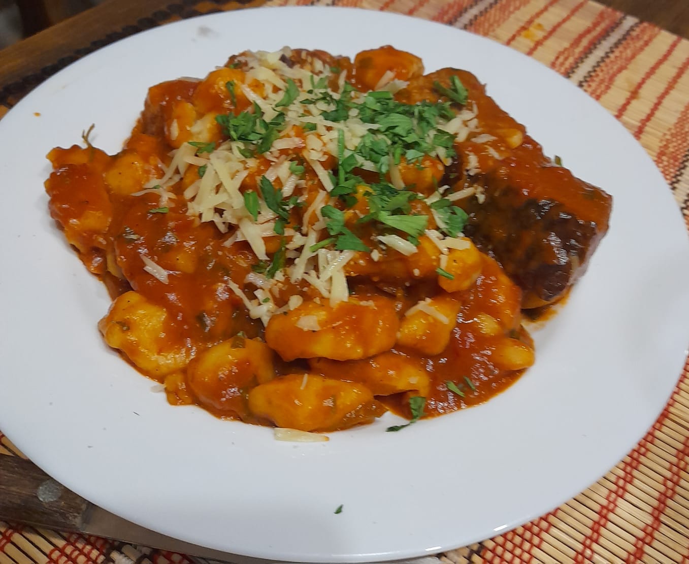 Hervir los ñoquis y en un sartén grande a fuego moderado colocar salsa de tomate y los ñoquis recién hervidos, un buen puñado de queso rallado, un chorro de oliva y albahaca, servir en una fuente familiar agregando la carne por encima y llevar a la mesa.