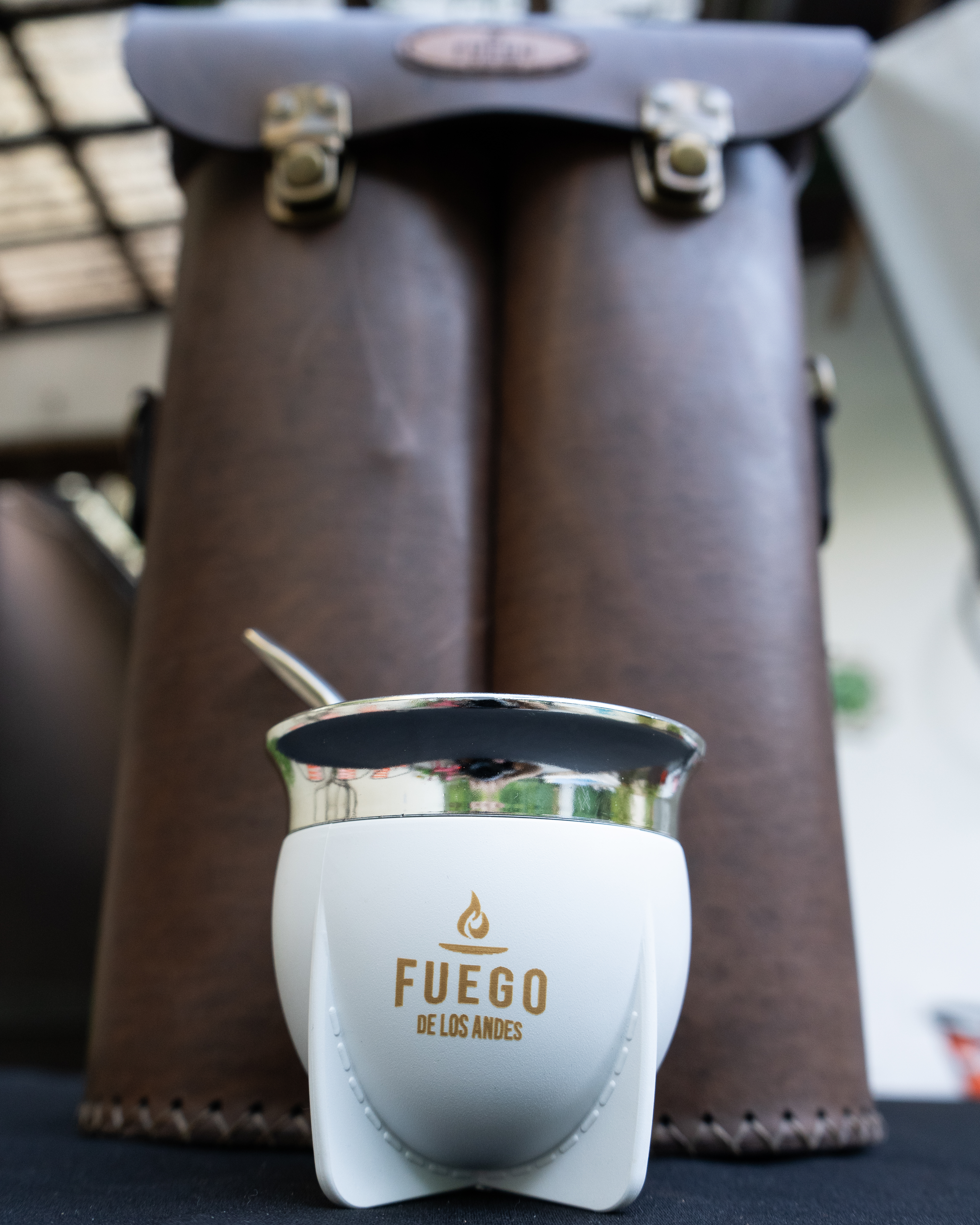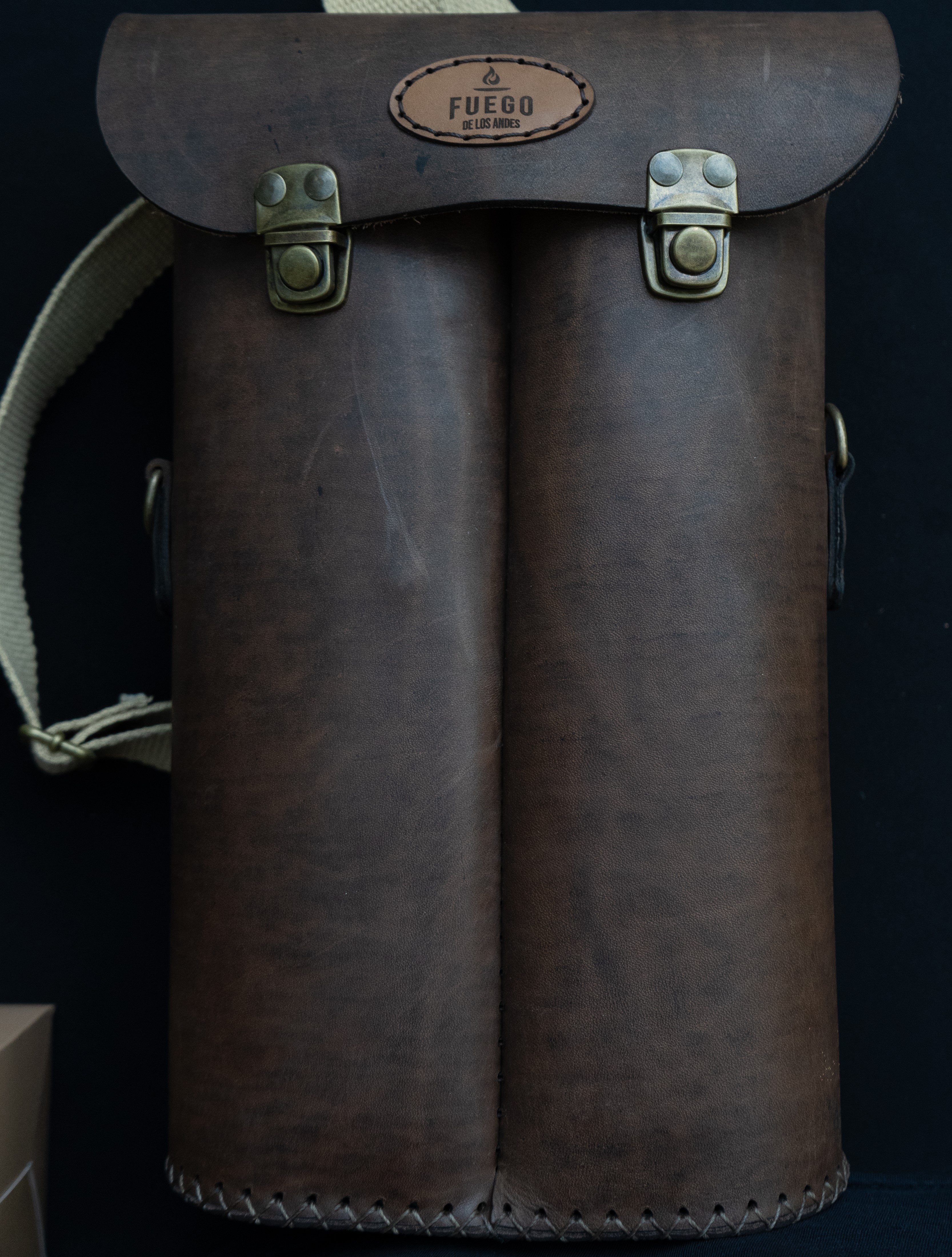 estuche matero / porta vinos de cuero crupon echo a mano con tira estilo mochila blanco, marrón y guinda.