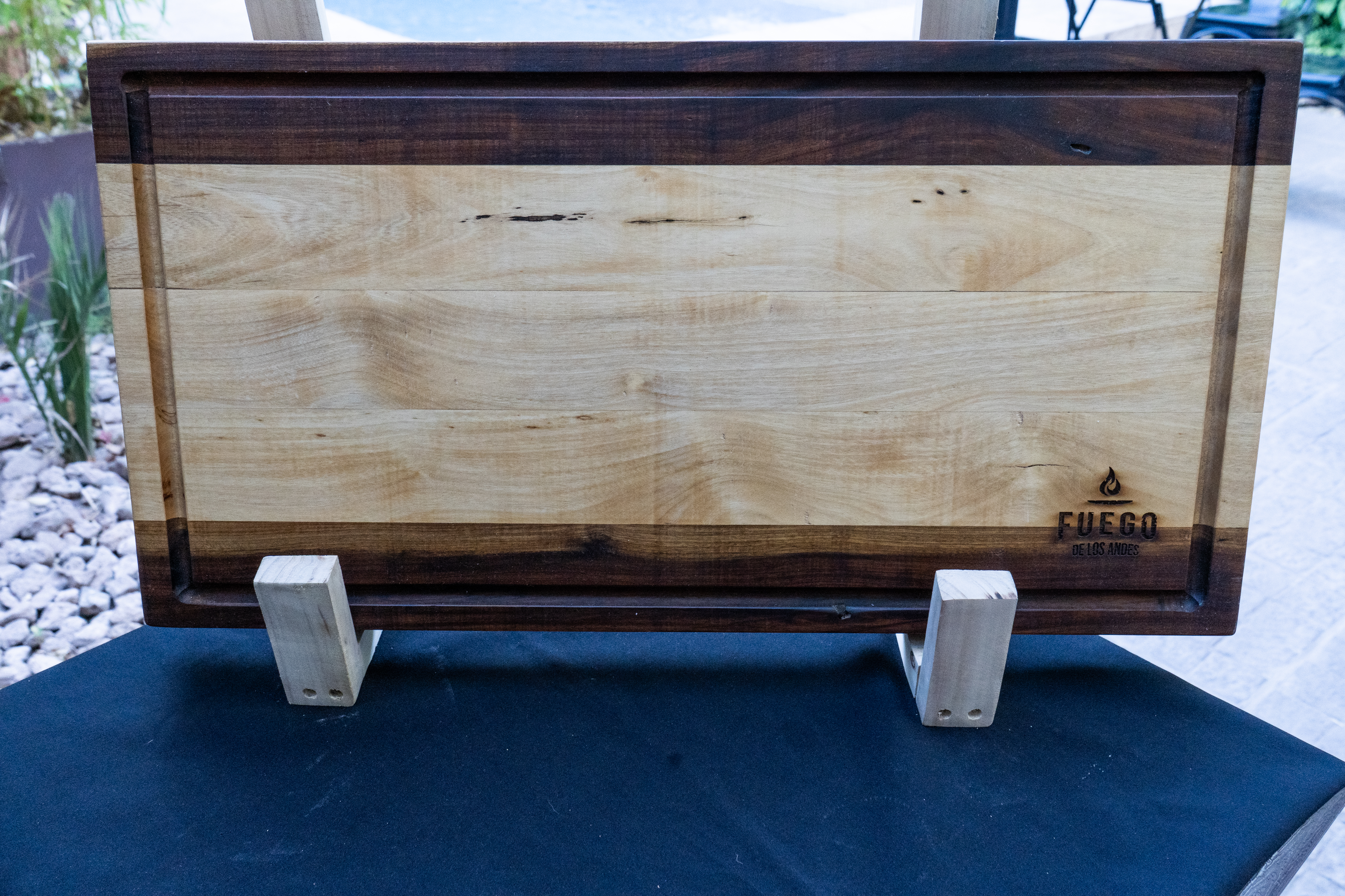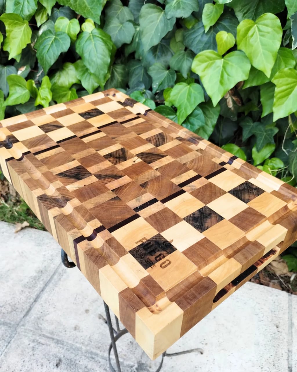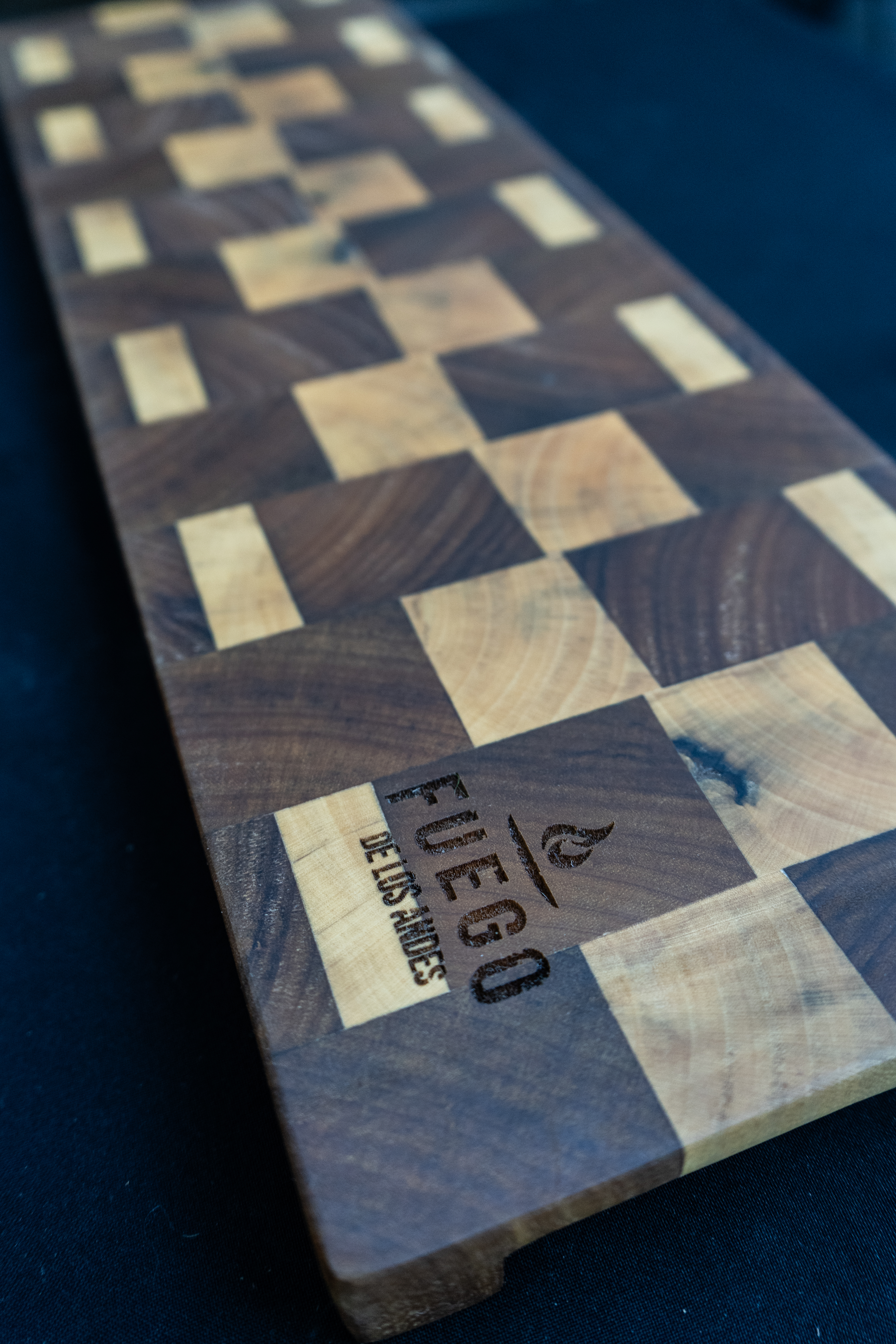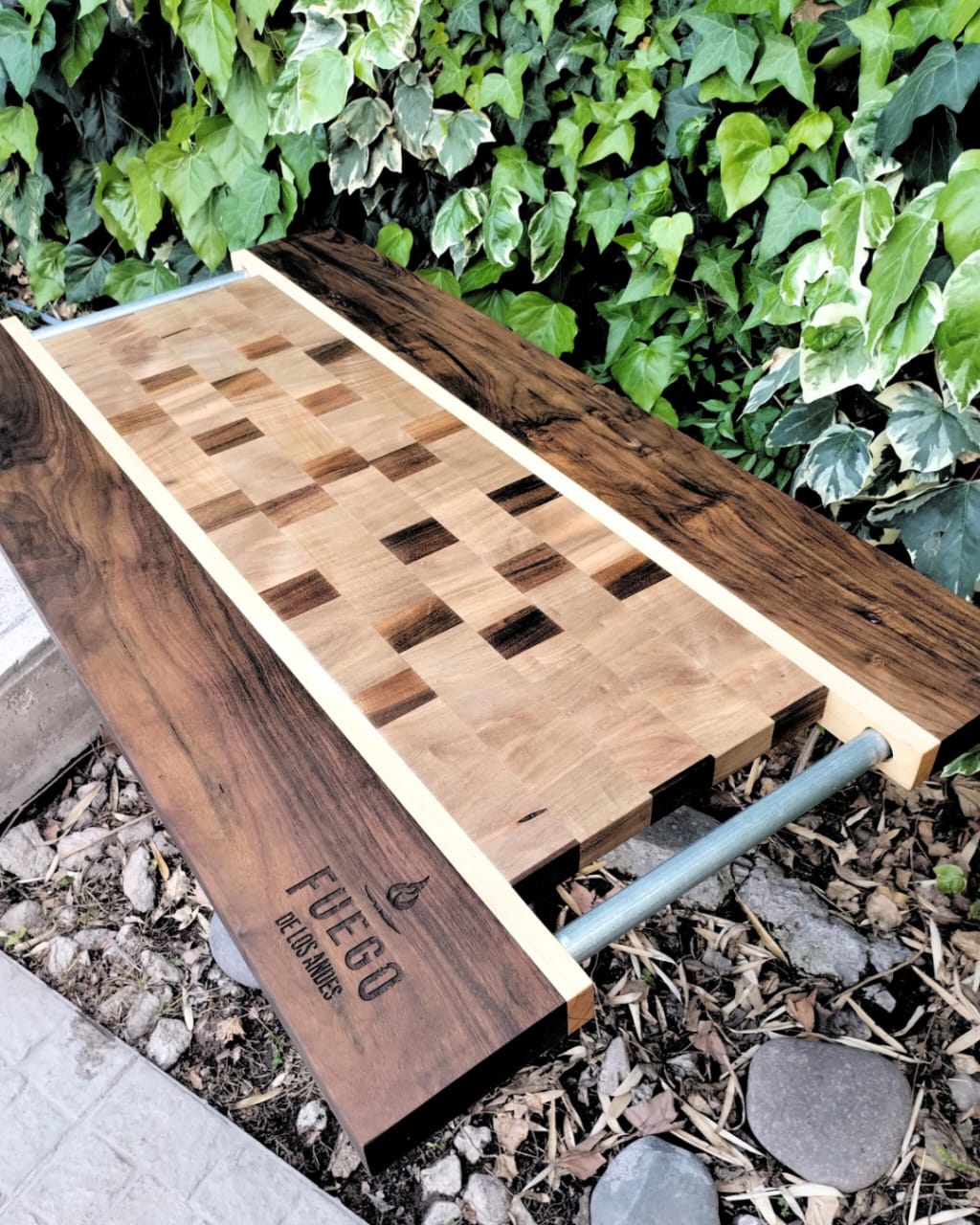 Tabla en madera de Zoita, Laurel y Guatambú con manijas de hierro. Medidas 120 x 64 cm (largo y ancho) x 45 mm (espesor)
